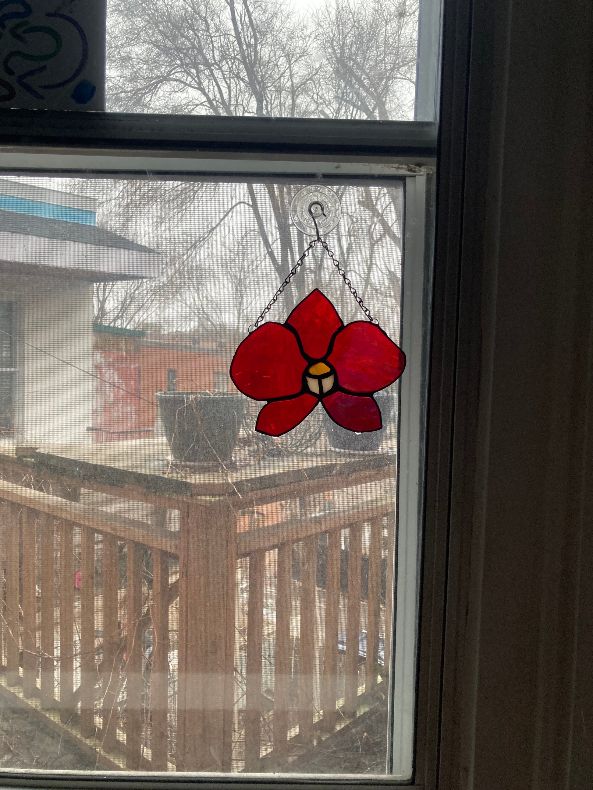 This delicate orchid is handcrafted from stained glass that shifts beautifully in the light, revealing a spectrum of colors with every glance. Its iridescent finish gives it a magical glow, making it feel alive as it catches the sun or soft indoor light. A perfect piece for adding a touch of elegance and wonder to any space, this orchid is both timeless and unique—an artful bloom that will never fade.