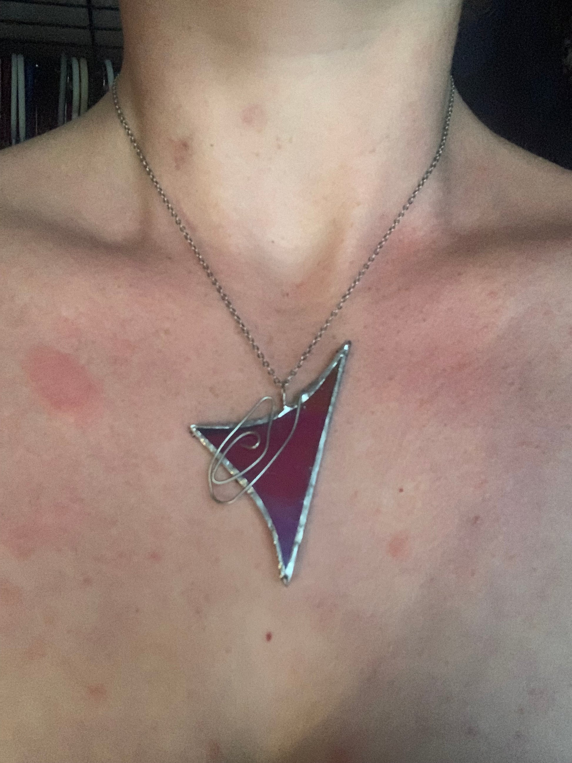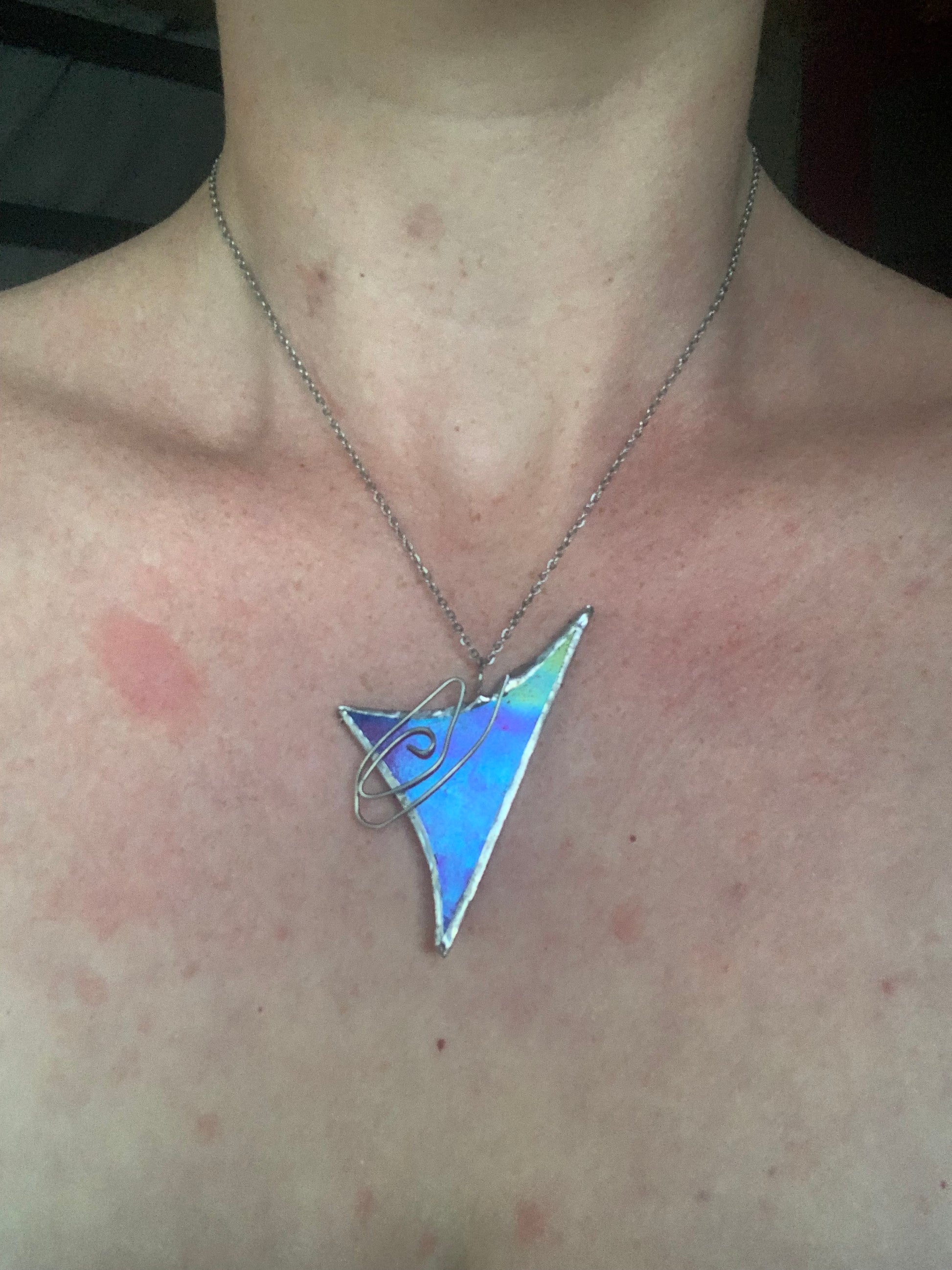 This striking pendant feels like a fragment of another dimension. Crafted from iridescent stained glass that shifts with every angle, its cosmic glow reflects hues of violet, aqua, and celestial blue. A sleek silver wire spiral wraps around the sharp triangular form, adding a touch of motion and mystery—like an orbiting planet suspended in space. Bold, futuristic, and ethereal, this piece is made for dreamers, stargazers, and anyone who dares to stand out.